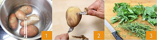 Um die Kräuter-Gnocchi mit Lauchcreme zuzubereiten, die Kartoffeln waschen und im Ganzen mit Schale für etwa eine halbe Stunde in Salzwasser kochen (wenn Sie einen Schnellkochtopf verwenden, dauert es etwa 15 Minuten). Nach dieser Zeit die Garzeit der Kartoffeln überprüfen, dann abtropfen lassen, leicht abkühlen lassen und noch heiß schälen 2. Die Kartoffeln durch ein Sieb passieren (oder durch eine Kartoffelpresse) und das Püree direkt auf ein Nudelbrett oder in eine große Schüssel fallen lassen. Die aromatischen Kräuter (Basilikum, Petersilie, Schnittlauch, Thymian) fein hacken 3