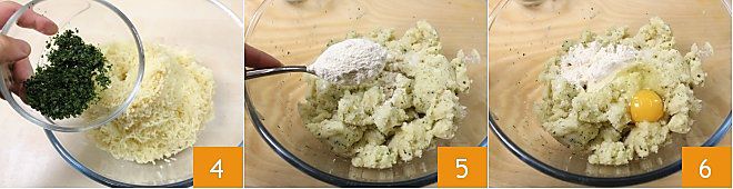 und zu den Kartoffeln geben 4, das Mehl 5, das Ei 6 hinzufügen und mit Salz abschmecken. Mit den Händen (nicht zu lange) kneten, bis ein homogener und ziemlich kompakter Teig entsteht.