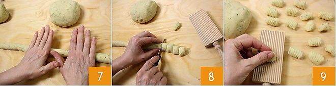 Aus dem erhaltenen Teig etwa 2,5 cm dicke "Stäbchen" formen 7 und in etwa 2 cm lange Stücke schneiden 8. Jedes Stück über das geriffelte Holzbrett 9 (oder über die Zinken einer Gabel) rollen, um die charakteristischen Rillen der Gnocchi und die darunter liegende Vertiefung zu formen, die zum besseren Aufnehmen der Sauce dient. Die erhaltenen Gnocchi an einem kühlen Ort auf einem sauberen, leicht bemehlten Tuch ablegen.