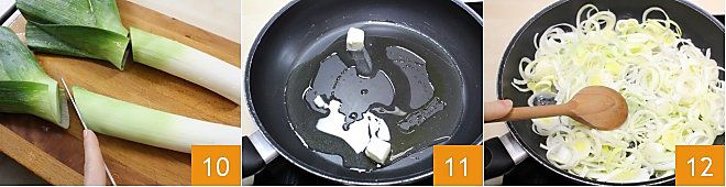 Bereiten Sie nun die Lauchcreme vor: Lauch putzen, waschen und fein schneiden 10 (nur den weißen und zarten Teil), dann in einer Pfanne mit Öl und Butter bei sehr schwacher Hitze für 15-20 Minuten dünsten lassen (11-12),