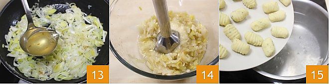 dann die Gemüsebrühe hinzufügen 13 und weitergaren, bis sie sehr weich sind. Weißen Pfeffer hinzufügen und gegebenenfalls mit Salz abschmecken, dann alles zu einer Creme pürieren 14. Die Gnocchi in reichlich Salzwasser (ein Portion nach der anderen) für wenige Minuten kochen 15