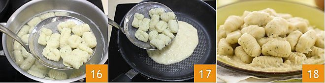 wenn sie an die Oberfläche kommen, abseihen 16 und zur in einer Pfanne befindlichen Creme hinzufügen 17. Einige Sekunden bei mittlerer Hitze schwenken, um sie mit der Creme zu vermischen, dann noch heiß servieren 18.