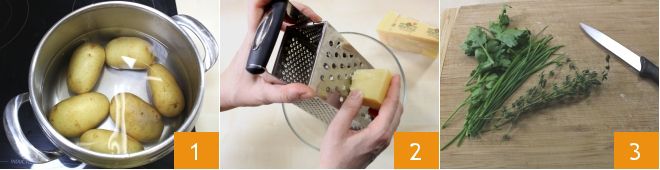 Um die mit Sbrinz gefüllten Kräuter-Gnocchi zuzubereiten, waschen Sie die Kartoffeln und kochen Sie sie ganz mit Schale in leicht gesalzenem Wasser 1. In der Zwischenzeit reiben Sie 150 g Käse 2 und schneiden 50 g davon in kleine Würfel. Hacken Sie die Kräuter zusammen 3.