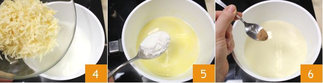 Während die Kartoffeln kochen, bereiten Sie die Sbrinz-Sauce vor, die zum Würzen der Gnocchi dient: Erhitzen Sie die Milch (oder Sahne) in einem kleinen Topf und fügen Sie den Sbrinz hinzu 4. Lassen Sie alles schmelzen und streuen Sie das Mehl darüber 5, warten Sie dann, bis die Sauce eindickt, und fügen Sie Pfeffer und Muskatnuss hinzu 6. Passen Sie eventuell die Menge des Salzes an und stellen Sie die Sauce beiseite.