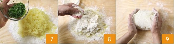 Entfernen Sie die Kartoffeln aus dem Wasser, wenn sie gar sind, und lassen Sie sie 5 Minuten abkühlen, dann schälen Sie sie und passieren Sie sie durch die Kartoffelpresse. Legen Sie das entstandene Püree auf eine Arbeitsfläche, auf die Sie die Hälfte des gesamten Mehls gestreut haben, und fügen Sie etwa 10 g gehackte Kräuter und das Salz hinzu 7. Bedecken Sie es mit dem Rest des Mehls 8 und kneten Sie es, bis ein homogener Teig entsteht 9.