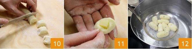 Formen Sie aus dem Teig Stränge, die Sie in Würfel schneiden 10 und füllen Sie jeden mit einem kleinen Stück Sbrinz 11 und rollen Sie sie über das gerillte Gnocchi-Brett, um die traditionelle Gnocchi-Form zu erhalten (alternativ können Sie auch die Zinken einer Gabel verwenden). Geben Sie die Gnocchi (eine Portion nach der anderen) in reichlich kochendes Salzwasser 12.