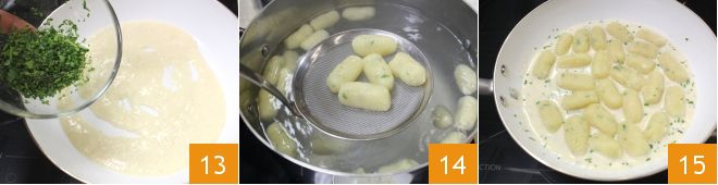 Erhitzen Sie die Sbrinz-Sauce und fügen Sie die anderen gehackten Kräuter hinzu 13, etwa einen Esslöffel, aber Sie können die Menge je nach Geschmack erhöhen oder verringern. Wenn die Gnocchi auftauchen, geben Sie sie ab 14 und geben Sie sie direkt in die Pfanne mit der Sbrinz-Sauce 15. Fertig sind Ihre mit Sbrinz gefüllten Kräuter-Gnocchi!