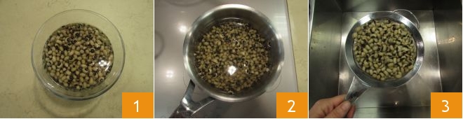 Um den Rotkrautsalat vorzubereiten, beginnen Sie damit, die Augenbohnen einzuweichen. Geben Sie sie in eine Schüssel, bedecken Sie sie mit reichlich Wasser und lassen Sie sie für mindestens 12 Stunden stehen 1. Nach dieser Zeit abtropfen lassen und abspülen. Dann in einen Topf mit reichlich Wasser geben und zum Kochen bringen 2. Während des Kochens kann es notwendig sein, den aufsteigenden Schaum zu entfernen. Lassen Sie sie etwa 25-30 Minuten köcheln, bis sie gar sind: Am Ende der Kochzeit sollten sie fest sein (weder zu knackig noch zu weich). Dann abtropfen lassen 3,