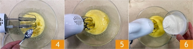 Fügen Sie eine Prise Salz hinzu 4 und mischen Sie mit dem Mixer 5. Geben Sie dann den Joghurt hinzu 6 und mischen Sie weiter, bis er gut eingearbeitet ist.