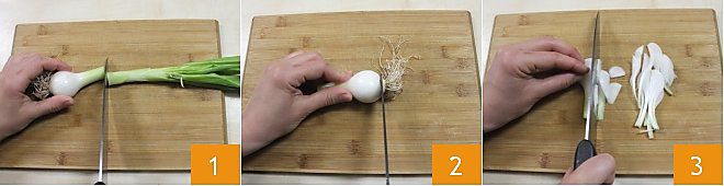 Um den Lachs-Clafoutis zuzubereiten, beginnen Sie mit dem Putzen der frischen Frühlingszwiebel: Schneiden Sie den Stiel ab 1, entfernen Sie die Basis 2 und hacken Sie sie fein 3.
