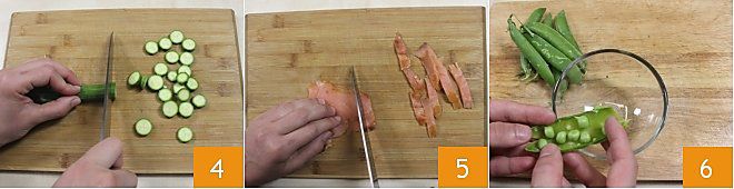 Waschen Sie die Babykürbisse sorgfältig, entfernen Sie die beiden Enden und schneiden Sie sie in Scheiben 4. Legen Sie auch das Lachsstück auf das Schneidebrett, schneiden Sie es in Streifen und bewahren Sie es bis zur Verwendung im Kühlschrank auf 5. Schälen Sie dann die frischen Erbsen, entfernen Sie die Schote und geben Sie sie in eine kleine Schüssel 6; Sie benötigen 100 g geschälte Erbsen.