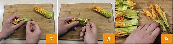 Nehmen Sie anschließend die Zucchiniblüten, waschen Sie sie, indem Sie sie vorsichtig in kaltes Wasser tauchen, dann lassen Sie sie abtropfen und legen sie auf ein trockenes Tuch, mit dem Sie sie leicht abtupfen. Legen Sie sie auf ein Schneidebrett und entfernen Sie die Auswüchse an der Basis des Kelches 7. Entfernen Sie die fleischigen Staubblätter im Inneren 8 und teilen Sie die Blüten in zwei Hälften 9. Legen Sie sie bis kurz vor dem Backen des Clafoutis in den Kühlschrank.