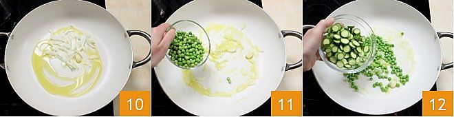 In einer antihaftbeschichteten Pfanne erhitzen Sie einen Schuss Öl und lassen eine geschälte Knoblauchzehe anbraten, danach fügen Sie die gehackte Frühlingszwiebel hinzu 10 und lassen sie anschwitzen. Dazu kommen die geschälten Erbsen und die in Scheiben geschnittenen Babykürbisse (11-12). Lassen Sie alles bei schwacher Hitze etwa 20 Minuten lang köcheln.