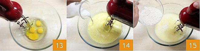In der Zwischenzeit bereiten Sie die Clafoutis-Mischung vor: Schlagen Sie die Eier in einer Schüssel auf und schlagen Sie sie mit einem elektrischen Mixer gut auf 13. Dann fügen Sie die Milch nach und nach hinzu 14 und schließlich das Mehl 15. Salzen und pfeffern Sie den Teig nach Geschmack.