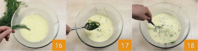 Fügen Sie dem Teig den Dill hinzu, indem Sie ihn mit den Händen zerkleinern 16, dann geben Sie das gekochte Gemüse hinein 17 und rühren, um die Masse zu vermengen 18.