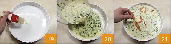 Zu diesem Zeitpunkt buttern Sie eine flache Form mit einem Durchmesser von 26 cm aus 19. Gießen Sie die Mischung in die Form 20, holen Sie den in Streifen geschnittenen Lachs aus dem Kühlschrank und legen Sie ihn nach Belieben auf die Mischung 21.