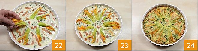 Nun dekorieren Sie mit den gereinigten und geteilten Zucchiniblüten: Legen Sie sie im Strahlenmuster auf die Mischung 22. Sobald das Ganze dekoriert ist 23, bleibt Ihnen nur noch, den Clafoutis in den vorgeheizten Ofen bei 180° für 30 Minuten zu schieben (wenn Sie einen Umluftofen verwenden, backen Sie ihn bei 160° für 20 Minuten). Wenn die Oberfläche schön goldbraun ist, ist Ihr Lachs-Clafoutis bereit, aus dem Ofen genommen und heiß serviert zu werden 24!