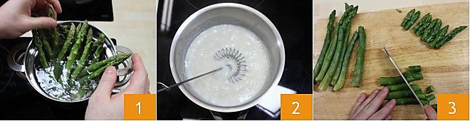 Um die Lachsquiche mit Spargel und Lauch zuzubereiten, beginnen Sie damit, die Spargel zu säubern: Entfernen Sie das harte Ende des Stängels, und entfernen Sie mit einem Sparschäler die härteren Fasern des Stängels. Dann kochen Sie die Spargel in einem Spargeltopf mit kochendem Salzwasser 1, wobei die Spitzen aus dem Wasser ragen. Während die Spargel kochen, bereiten Sie die Béchamelsauce zu: Bereiten Sie die Mehlschwitze mit Butter und Mehl vor, fügen Sie dann die heiße Milch hinzu, rühren Sie alles um, salzen und fügen Sie Muskatnuss hinzu 2. Sobald die Spargel gekocht sind, schneiden Sie die Stängel in Scheiben und behalten die Spitzen ganz 3,