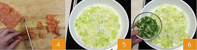 nehmen Sie den Lachs und schneiden Sie ihn in ziemlich große Streifen 4. Dann erhitzen Sie Öl und Butter, geben Sie die Lauch hinzu, die Sie vorher geputzt und fein geschnitten haben 5 (nur den weißen Teil), und lassen Sie sie weich werden, ohne Farbe zu nehmen. Wenn die Lauch gut weich sind, fügen Sie die geschnittenen Spargel in die Pfanne hinzu 6 (behalten Sie die Spitzen beiseite) und lassen Sie alles ein paar Minuten aromatisieren.
