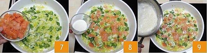 Fügen Sie den geschnittenen Lachs hinzu 7; fügen Sie die Sahne hinzu 8, rühren Sie um und fügen Sie nach einer Minute auch die Béchamelsauce hinzu 9, lassen Sie alles 5 Minuten kochen.