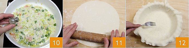 Vermischen Sie alles gut, dann würzen Sie mit Salz und Pfeffer und schalten Sie den Herd ab 10. Bereiten Sie die Mürbeteig zu, indem Sie kalte Butter und Mehl in einen Mixer geben, auf eine Arbeitsfläche übertragen, Wasser hinzufügen und alles kneten. Dann fetten Sie eine flache Quicheform mit einem Durchmesser von 26 cm ein und legen Sie den Mürbeteig hinein, stechen Sie den Teig mit einer Gabel 12