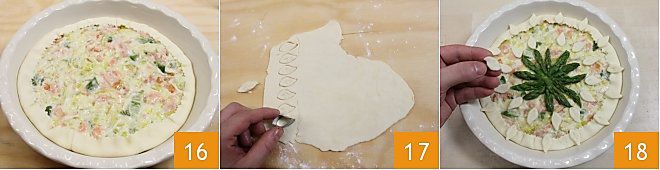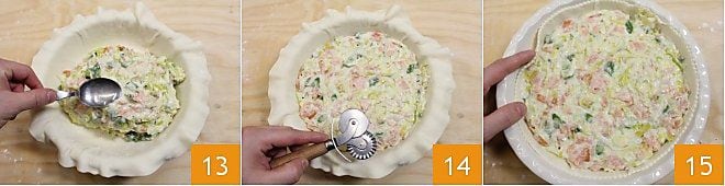 und geben Sie die vorher zubereitete Mischung hinein 13. Entfernen Sie mit einem Teigschneider den überflüssigen Teig 14 und schließen Sie die Ränder der Quiche zur Innenseite der Form hin (15-16)
