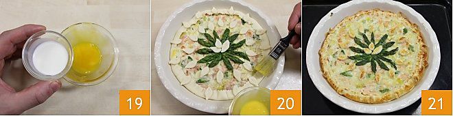 Dann verquirlen Sie die Milch mit einem Eigelb 19 und bestreichen Sie den Mürbeteig, um ihn glänzend zu machen 20 und backen Sie im vorgeheizten Ofen bei 190° für 25-30 Minuten (170 Grad für 20 Minuten im Umluftofen), bis der Mürbeteig gut goldbraun und knusprig ist 21. Nehmen Sie die Quiche heraus, lassen Sie sie 5 Minuten ruhen und schneiden Sie sie dann und servieren Sie sie warm oder lauwarm.