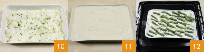 Streuen Sie ein wenig gemahlenen Pfeffer und legen Sie eine Schicht dünn geschnittener Raspadura und ein paar Thymianblättchen 10. Wiederholen Sie den Vorgang, indem Sie die Zutaten abwechseln, bis Sie 4 Schichten Lasagne erhalten. Beenden Sie die letzte Schicht mit der Béchamelsauce 11, dann fügen Sie ein paar dünne Scheiben Raspadura, die Spargelspitzen und eine Prise gemahlenen Pfeffer und Thymianblättchen hinzu. Backen Sie die Lasagne mit Spargel und Raspadura in einem vorgeheizten statischen Ofen bei 160° für etwa 30-40 Minuten (wenn er belüftet ist, bei 140° für etwa 20-30 Minuten) 12. Lassen Sie die Lasagne mit Spargel und Raspadura vor dem Servieren mindestens 10 Minuten außerhalb des Ofens ruhen, damit sie sich setzen und besser festigen. Ihre Lasagne mit Spargel und Raspadura ist bereit, serviert zu werden!