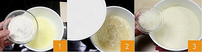 Um die Lasagne mit Spargel und Raspadura zuzubereiten, bereiten Sie zuerst die Béchamelsauce zu; schmelzen Sie die Butter und sieben Sie das Mehl in einem Regen hinein, um den Roux 1 zu erstellen, während Sie mit einem Schneebesen rühren. Fügen Sie die leicht erwärmte Milch hinzu und rühren Sie, bis sie eingedickt ist 2; salzen Sie und würzen Sie mit Muskatnuss. Am Ende der Zubereitung, bei ausgeschaltetem Feuer, mischen Sie den Pecorino unter und rühren Sie gut um 3.