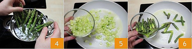 Reinigen Sie den Spargel, kochen Sie ihn dann in kochendem Wasser (es sollte sanft kochen) im speziellen Spargeltopf, wobei die Spitzen draußen bleiben, die durch Dampf garen; der Spargel sollte gekocht werden, aber knackig bleiben 4. Lassen Sie den Spargel gut abtropfen: Schneiden Sie die Spitzen (ca. 5 cm lang) ab und schneiden Sie die Stiele in Ringe. Lassen Sie 30 g Butter in einer Pfanne schmelzen und werfen Sie die Spargelstiele hinein, indem Sie sie salzen (ein paar Minuten reichen) 5; auf diese Weise trocknen sie von der restlichen Kochflüssigkeit und werden gleichzeitig aromatisiert. Machen Sie dasselbe in einer anderen Pfanne mit den Spargelspitzen, achten Sie darauf, dass sie nicht zerfallen 6.
