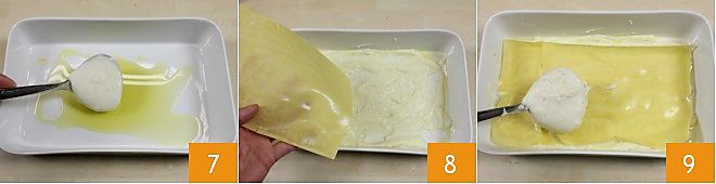 Fahren Sie mit dem Zusammenstellen der Lasagne mit Spargel und Raspadura fort: Geben Sie auf den Boden einer Auflaufform (oder eines Backofens) von 18x28 cm 3 Esslöffel Öl und eine Schicht Béchamelsauce 7, dann legen Sie die erste Schicht Eierlasagne 8. Bedecken Sie die Lasagne mit einer Schicht Spargel und einer Schicht Béchamelsauce 9.