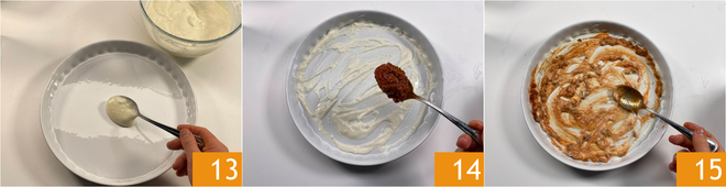 In einer runden Auflaufform mit einem Durchmesser von 30 cm eine Schicht Béchamel 13 und eine Schicht Ragù 14 verteilen, umrühren, um die Würze zu mischen 15.