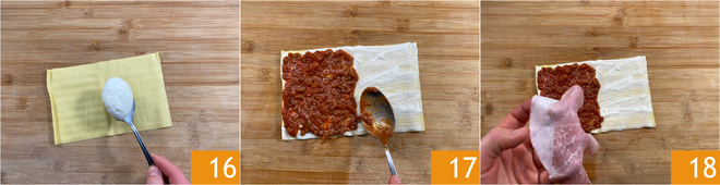 Nehmen Sie nun ein Eierblatt und bestreichen Sie es mit Béchamel 16, dann verteilen Sie das Ragù auf der Hälfte des Blattes oder etwas mehr 17. Legen Sie eine Scheibe gekochten Schinken auf das Ragù 18.