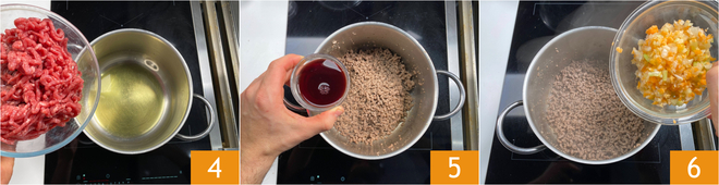 Fügen Sie das Hackfleisch hinzu 4, zerbröseln Sie es mit dem Löffel und lassen Sie es braten, bis der Boden trocken ist. Dann mit dem Wein ablöschen 5 und den Alkohol verdampfen lassen, danach die Gemüsemischung hinzufügen 6.