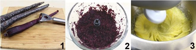 Um die lila Karotten-Cupcakes zuzubereiten, beginnen Sie damit, die lila Karotten zu schälen 1, entfernen Sie die Enden und hacken Sie sie fein in einem Mixer 2. Mit einer Küchenmaschine schlagen Sie die Eier zusammen mit dem Zucker, bis Sie eine helle und schaumige Masse erhalten 3;