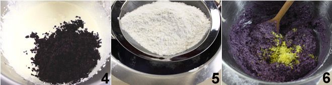 Fügen Sie zu diesem Zeitpunkt die gehackten Karotten 4, die gesiebte Speisestärke und das 00- sowie Mandelmehl, das Backpulver 5 und das Mark der Vanilleschote hinzu. Vermengen Sie die Mischung und fügen Sie auch die geriebene Zitronenschale (oder Orangenschale) hinzu 6.