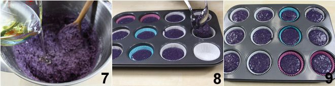 Zum Schluss geben Sie nach und nach das Pflanzenöl hinzu 7 und mischen Sie gut. Der Teig sollte sehr weich sein, falls nicht, fügen Sie 1-2 Esslöffel Milch bei Raumtemperatur hinzu. Lassen Sie den so gewonnenen Teig etwa 30 Minuten bei Raumtemperatur ruhen, damit sich die Farbe der lila Karotte mit den anderen Zutaten verbindet. Legen Sie eine Muffinform mit Papierförmchen aus und füllen Sie mit zwei Löffeln jedes Förmchen 8, wobei Sie einen Zentimeter vom oberen Rand freilassen, um zu vermeiden, dass die Masse beim Backen überläuft 9. Backen Sie dann bei 180°C etwa 25 Minuten und überprüfen Sie die Garzeit der Cupcakes mit einem Holzstäbchen. Nehmen Sie die lila Karotten-Cupcakes aus dem Ofen und lassen Sie sie vollständig abkühlen, bevor Sie sie dekorieren.