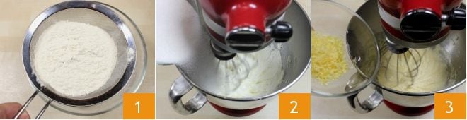 Um die Limoncello-Cupcakes zuzubereiten, beginnen Sie damit, das Mehl und das Backpulver mit einem feinen Sieb zu sieben 1. Dann geben Sie die weiche Butter und den Zucker in eine Küchenmaschine 2; schalten Sie die Rührbesen ein, um die Zutaten zu vermengen (wenn Sie keine Küchenmaschine haben, können Sie auch einen elektrischen Handmixer verwenden). Fügen Sie der Masse die abgeriebene Schale einer unbehandelten Zitrone hinzu 3 und rühren Sie weiter.