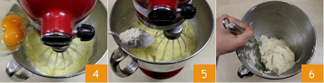 Fügen Sie auch die 2 Eier nacheinander hinzu 4, dann eine Prise Salz und schließlich nach und nach das gesiebte Mehl mit dem Backpulver, wobei Sie einen Löffel zur Hilfe nehmen 5. Nehmen Sie dann die Mischung aus der Küchenmaschine und rühren Sie mit einem Spatel, um die Zutaten zu einem homogenen Teig zu verbinden 6.