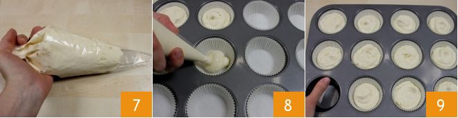 Füllen Sie die Masse in einen Spritzbeutel 7. Nehmen Sie dann ein Muffinblech für 12 Muffins und legen Sie jede Form mit einem Papierförmchen aus. Geben Sie die Masse in jedes Förmchen 8 und achten Sie darauf, nicht über die Hälfte zu füllen 9, damit die Cupcakes nach dem Backen am Rand der Förmchen ankommen. Backen Sie im vorgeheizten statischen Ofen bei 180° für 20 Minuten (160° für 15 Minuten, wenn Umluft verwendet wird).