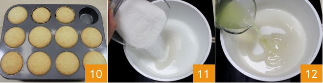 Nachdem die Cupcakes gebacken sind, nehmen Sie die Form heraus und lassen Sie sie abkühlen 10. In der Zwischenzeit fahren Sie mit der Zubereitung der Buttercreme fort (Sie können das Verfahren für die Buttercreme auch hier einsehen). Geben Sie in eine große Pfanne Wasser und dann den Zucker 11. Fügen Sie nun auch den Limoncello hinzu 12 und rühren Sie um.