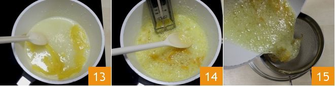 Schalten Sie die niedrige Hitze ein und geben Sie auch die Schalen von 2 ganzen Zitronen hinzu und rühren Sie weiter 13. Wenn der Zucker geschmolzen ist, lassen Sie den Sirup ohne weiteres Rühren kochen und überprüfen Sie mit einem Thermometer, dass er 121° erreicht 14. Dann schalten Sie die Hitze aus und filtern den gewonnenen Sirup mit einem feinen Sieb, indem Sie ihn in einer kleinen Schüssel auffangen 15.