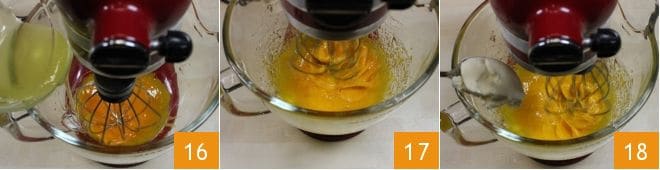 Geben Sie in eine Küchenmaschine die Eigelbe und schalten Sie die Rührbesen ein (wenn Sie keine Küchenmaschine haben, können Sie eine große Schüssel und einen elektrischen Handmixer verwenden). Fügen Sie dann den heißen Sirup langsam hinzu 16. Lassen Sie die Zutaten schlagen, bis sie vollständig abgekühlt sind 17. Während die Masse abkühlt, arbeiten Sie in einer kleinen Schüssel die kalte, aber weiche Butter zu einer Creme. Fügen Sie dann die Buttercreme den Eigelben mit dem Sirup nach und nach hinzu, wobei Sie weiter mit den Rührbesen rühren 18.