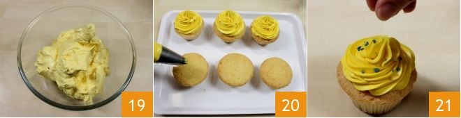 Geben Sie die schaumige und homogene Creme in eine kleine Schüssel 19. Wenn Sie sie nicht sofort verwenden, stellen Sie sie mit Frischhaltefolie bedeckt in den Kühlschrank, bis Sie die Cupcakes dekorieren. Nehmen Sie dann die Cupcakes aus der Form, geben Sie die Buttercreme in einen Spritzbeutel mit Sterntülle und beginnen Sie, sie mit einem Sahnetupfen zu dekorieren 20. Sie können die Limoncello-Cupcakes zusätzlich mit bunten Zuckerperlen oder anderen Streuseln, die Sie bevorzugen, dekorieren 24. Bewahren Sie die Limoncello-Cupcakes im Kühlschrank auf, bis Sie sie servieren!