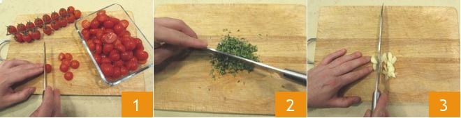 Um die Linguine mit confierten Tomaten zuzubereiten, beginnen Sie damit, die Kirschtomaten zu waschen und sie halbiert zu schneiden 1. Bereiten Sie auch eine Mischung aus Thymian 2 vor und hacken Sie den Knoblauch etwas grober 3.