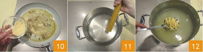 Bei niedriger Hitze schmelzen lassen, dann das Paniermehl hinzufügen 10 und einige Minuten goldbraun rösten. In der Zwischenzeit die Bavette in reichlich kochendem Salzwasser kochen 11 und al dente abgießen 12.