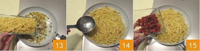 Dann zum goldbraunen Paniermehl in der Pfanne hinzufügen 13 und mit einer Kelle Nudelkochwasser verlängern 14. Auch die confierten Kirschtomaten hinzufügen 15