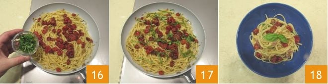 und die in Stücke gerissenen Basilikumblätter 16. Die Linguine mit confierten Kirschtomaten einige Minuten anbraten 17, dann auf die Teller verteilen und heiß genießen 18!