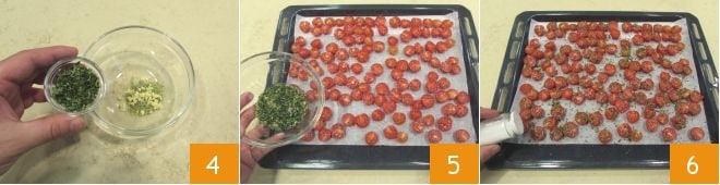 In einer kleinen Schüssel den Knoblauch 4 und den Thymian vereinen und mit dem Oregano vermischen. In der Zwischenzeit die Kirschtomaten mit der Schnittseite nach oben auf ein mit Backpapier ausgelegtes Backblech legen und mit der Kräutermischung bestreuen 5. Die Kirschtomaten mit Zucker, Pfeffer und Salz bestreuen 6