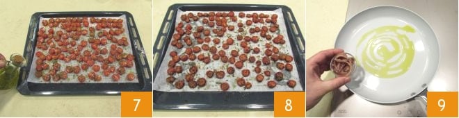 und zum Schluss mit Olivenöl extra vergine beträufeln 7. Die so gewürzten Kirschtomaten in einem vorgeheizten Umluftofen bei 140°C etwa anderthalb Stunden lang backen: Sie sollen langsam welken, weich und trocken werden 8. Dann zum Rest der Sauce für die Pasta übergehen: In einer großen antihaftbeschichteten Pfanne das Öl erhitzen und die Anchovis hinzufügen 9.